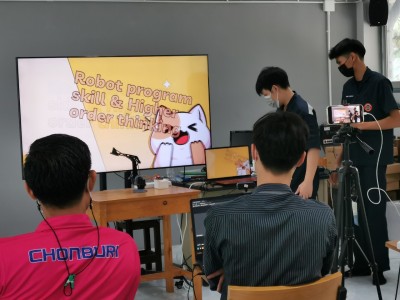 นักเรียนผู้เข้ารับการอบรมนำเสนอผลงานกลุ่ม การโปรแกรมหุ่นยนต์ที่กลุ่มของตนเองคิดค้น