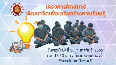 ประชาสัมพันธ์ โครงการฝึกสมาธิพัฒนาจิตเพื่อเสริมสร้างการเรียนรู้ วันพฤหัสบดีที่16 กุมภาพันธ์ 2566 เวลา 13.30 น ณ ห้องประชุมจามจุรี วิทยาลัยเทคนิคชลบุรี